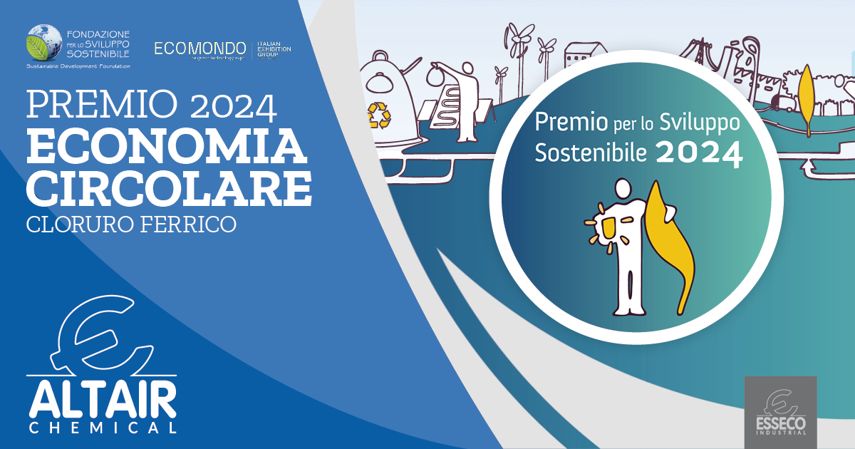 Rimini, 7 novembre – Altair Chemical, divisione cloro-alcali di Esseco Industrial, è stata premiata tra le 10 migliori aziende italiane nella categoria Economia Circolare del Premio per lo Sviluppo Sostenibile a Ecomondo 2024, per l’innovativa progettualità del “Cloruro Ferrico”. La premiazione riconosce l’impegno di Altair nella sostenibilità e nell’innovazione attraverso un sistema di produzione ecocompatibile e altamente efficiente che pone l’azienda all’avanguardia nel settore del trattamento delle acque e nella riduzione dell’impatto ambientale.