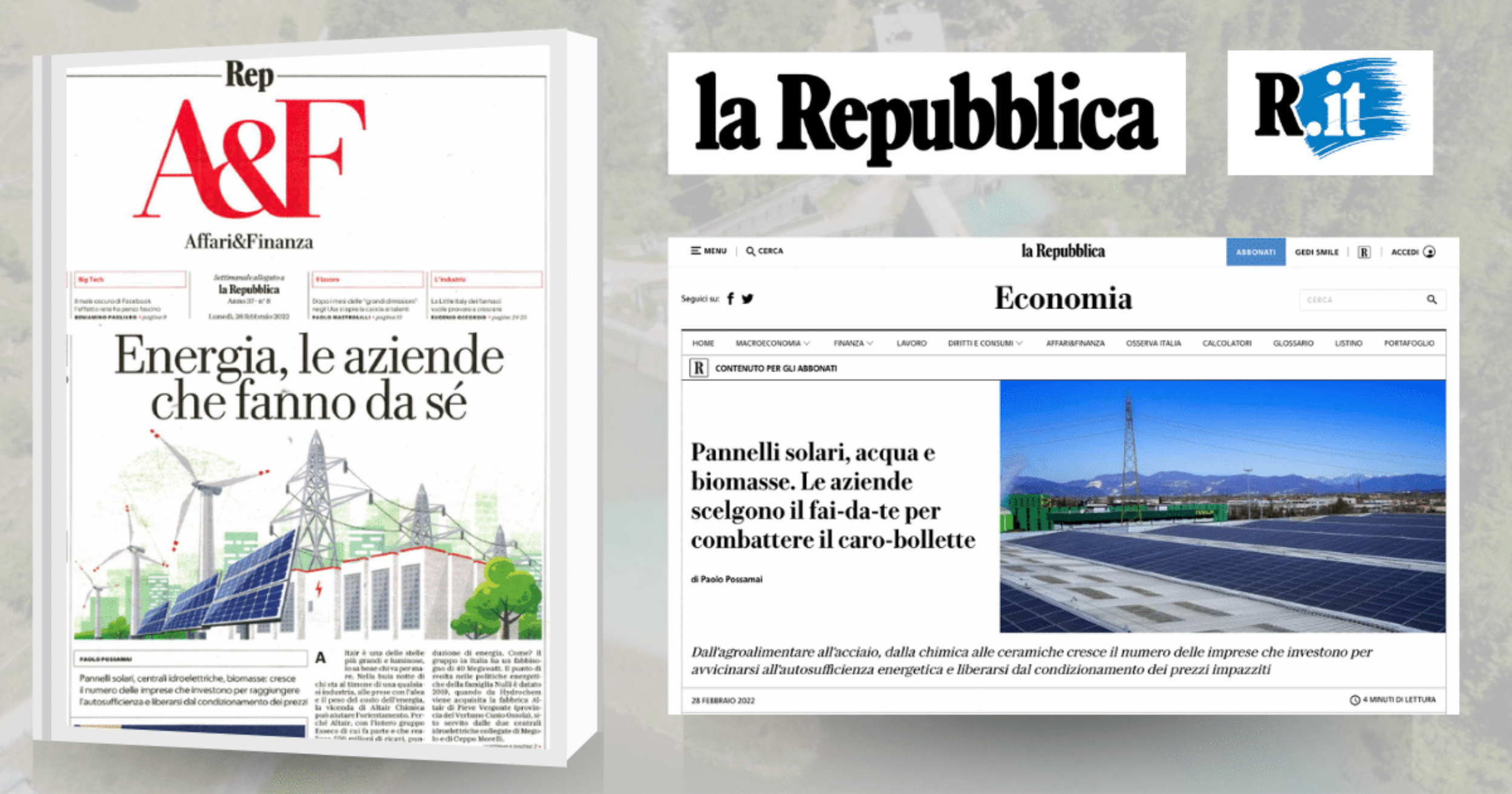 Per leggere l’articolo completo: La Repubblica – Pannelli solari, acqua e biomasse. Le aziende scelgono il fai-da-te per combattere il caro-bollette