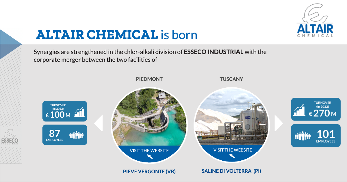 These are the goals behind the creation of Altair Chemical, the new entity in the Italian chemical industry resulting from the merger of two Esseco Industrial companies: Altair Chimica in Saline di Volterra, Tuscany, acquired in 2011, and Hydrochem Italia in Pieve Vergonte, Piedmont, taken over from a crisis committee in 2019.