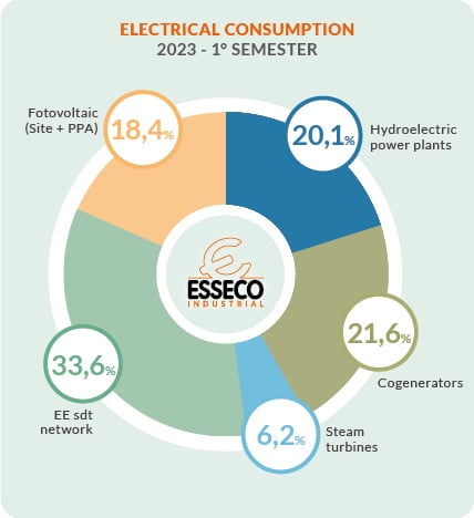 Steam also plays a role in the production processes of Esseco Industrial, contributing 6.2% with CO2-free energy. By recovering the heat released in the sulfur combustion process, we are able to operate two steam turbines for a total of 6.74 MWe in Esseco.