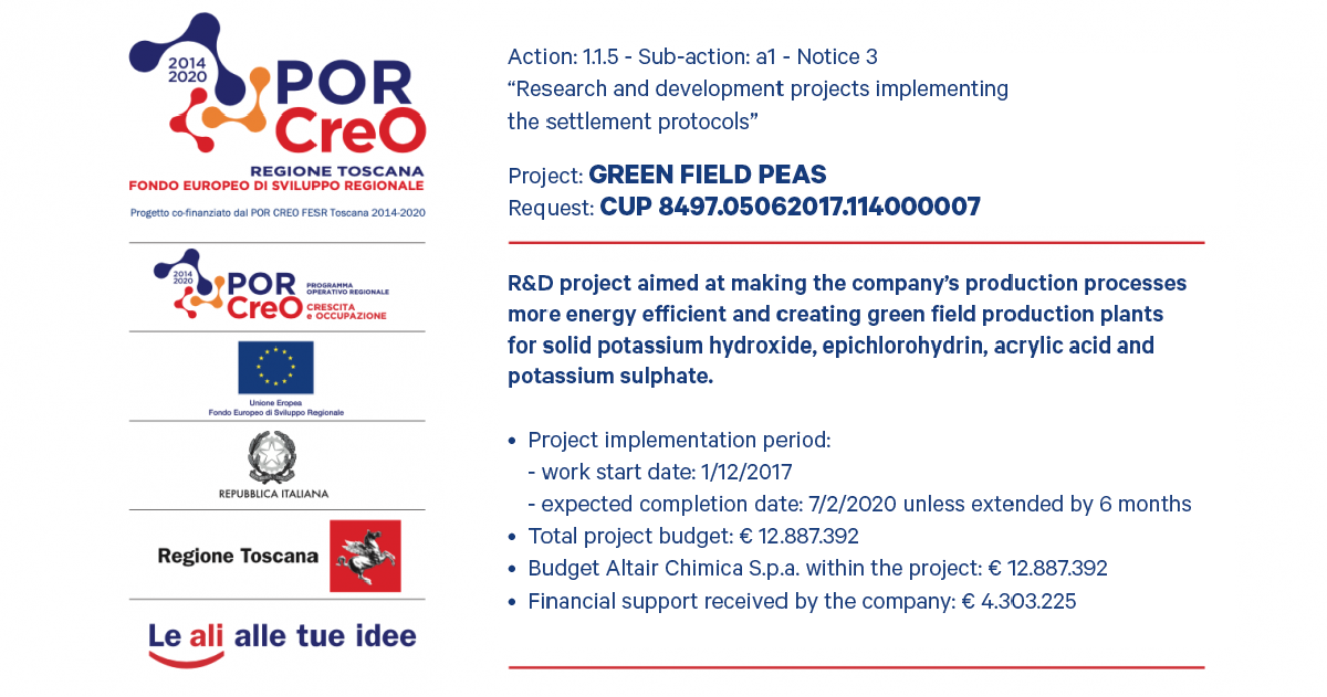On August 4, 2017, ALTAIR CHIMICA submitted a grant application as part of the Tuscany Region’s call for Research and Development Projects (within the Regional Operational Programme for Growth and Employment) and the European Union (through the European Regional Development Fund) for the G.R.E.E.N. FIELD PEAS project. This is an R&D project aimed at energy efficiency of corporate production processes and the establishment of greenfield production plants for solid potassium hydroxide, epichlorohydrin, acrylic acid, and potassium sulfate. Initiated by Altair Chimica on December 1, 2017, the project was granted funding on February 7, 2018.