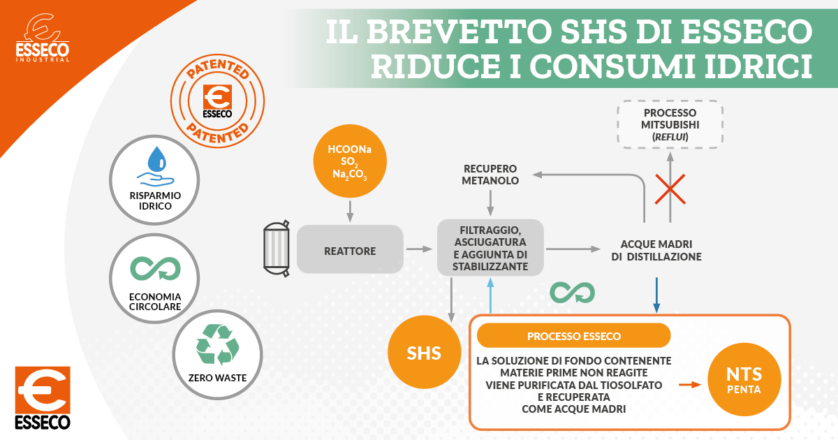 Abbiamo trasferito nel nostro stabilimento di San Martino di Trecate (NO) la produzione di Sodio Idrosolfito (SHS), sviluppando e brevettando un processo produttivo innovativo che consente, al contrario dei metodi tradizionali per la produzione di Sodio Idrosolfito (SHS), di ridurre il consumo di acqua e di evitare lo sversamento di reflui.
