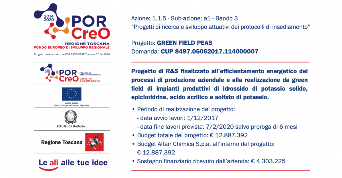 ALTAIR CHIMICA ha presentato in data 4/8/2017 domanda di contributo nell’ambito del bando per Progetti di Ricerca e Sviluppo della Regione Toscana (all’interno del Programma Operativo Regionale Crescita e Occupazione) e dell’Unione Europea (attraverso il Fondo Europeo di Sviluppo Regionale) per la realizzazione del progetto G.R.E.E.N. FIELD PEAS: si tratta di un progetto di Ricerca e Sviluppo (R&S) finalizzato all’efficientamento energetico dei processi di produzione aziendale e alla realizzazione da green field di impianti produttivi di idrossido di potassio solido, epicloridrina, acido acrilico e solfato di potassio. Il progetto, avviato da Altair Chimica il 1° Dicembre 2017, è stato ammesso al finanziamento in data 7/02/2018.